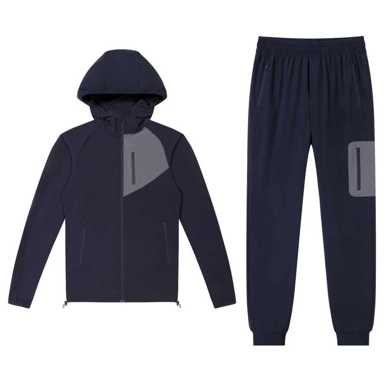 Each tracksuit set features a windbreaker jacket paired with trail track pants, offering the perfect balance of performance and fashion. The nylon–spandex woven polyester blend ensures stretch, breathability, and weather resistance. With extra pockets and heavy-duty stitching, these tracksuits are practical for everyday wear while maintaining a sleek look.